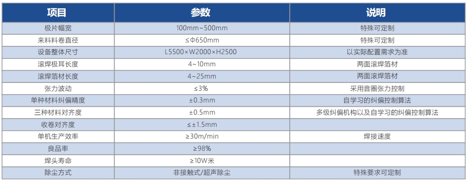 设备优势: · 采用多级纠偏控制焊接材料对齐度,自学习纠偏控制算法。 · 采用主动式同步缓存控制,低惯量匀速走带。 · 音圈电机张力控制,张力波动小。 · 焊接压力闭环检测及焊接闭环检测功能。 · 滚焊位粉尘隔离及收集装置,减少污染。 · 非接触式除尘/超声除尘。 · 卧式台面设计,操作维护方便。